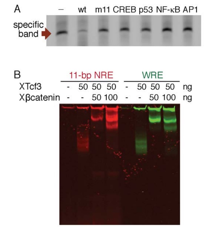 (B) Purified Xenopus beta-catenin and Tcf3 proteins bound to the 11-bp NRE and WRE in dose dependent manner.