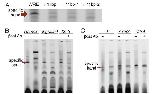 (CâF) EMSA analysis. Every panel shown comes from a single gel. Each experiment was repeated two to four times. In all gels, the red arrow indicates the specific EMSA band.