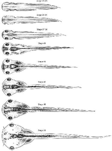 Fig. 4. Dorsal views of 8 stages of Xenopus development. Anterior is towards the left. Stage 48 is shown with mouth open. Drawings by Natalya Zahn licensed under CC-BY-NC at http://ase.tufts.edu/biology/faculty/adams/zahnDrawings.htm and reproduced with permission. |