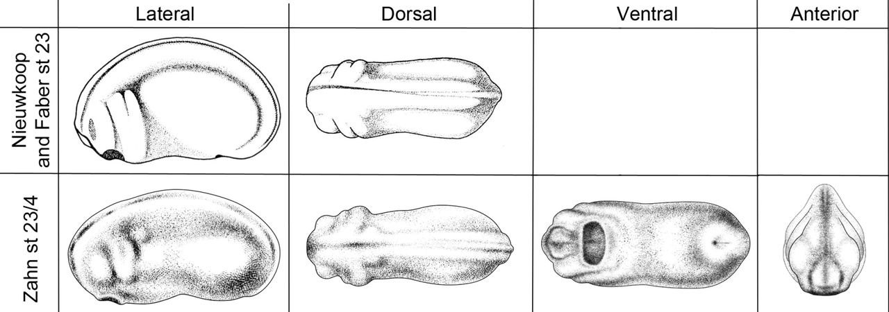 Fig. 1. Comparison of the styles of the drawings by Prijs and Zahn. Lateral and dorsal drawings of stage 23 Xenopus from Nieuwkoop and Faber (1994) and of stage 23/24 Xenopus by Natalya Zahn for comparison of the styles. Drawings of stage 24 Xenopus ventral and anterior views by Zahn are also shown. The goal was for the styles to be similar enough for the Zahn drawings to be put to use as quickly as possible, yet distinct enough for the correct artist to be recognized and acknowledged. Drawings by Natalya Zahn licensed under CC-BY-NC at http://ase.tufts.edu/biology/faculty/adams/zahnDrawings.htm and reproduced with permission. |