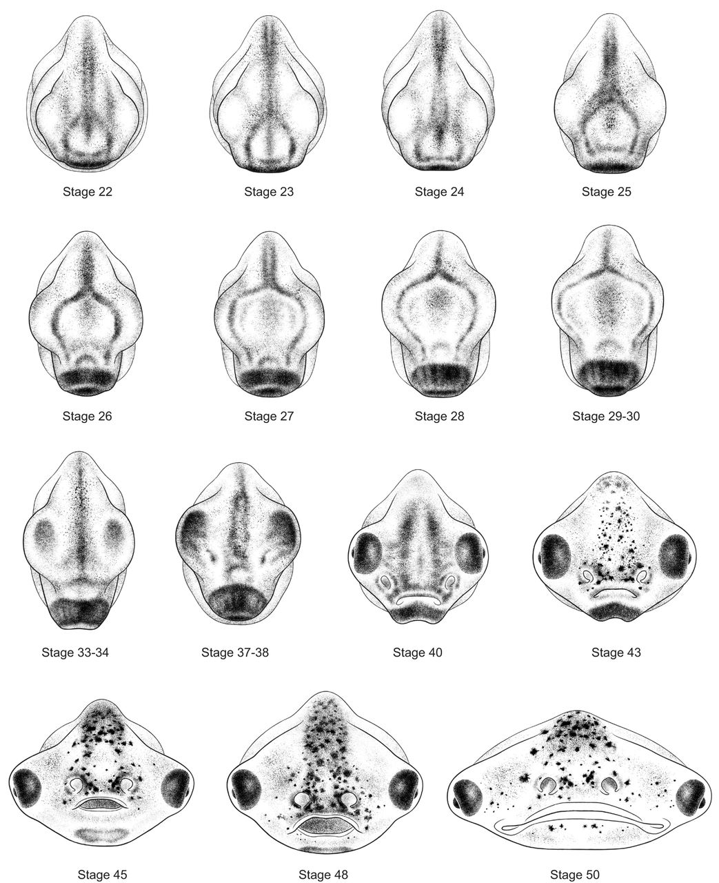 Fig. 3. Anterior views of 15 stages of Xenopus development. Stage 48 is shown with mouth open. Drawings by Natalya Zahn licensed under CC-BY-NC at http://ase.tufts.edu/biology/faculty/adams/zahnDrawings.htm and reproduced with permission. |