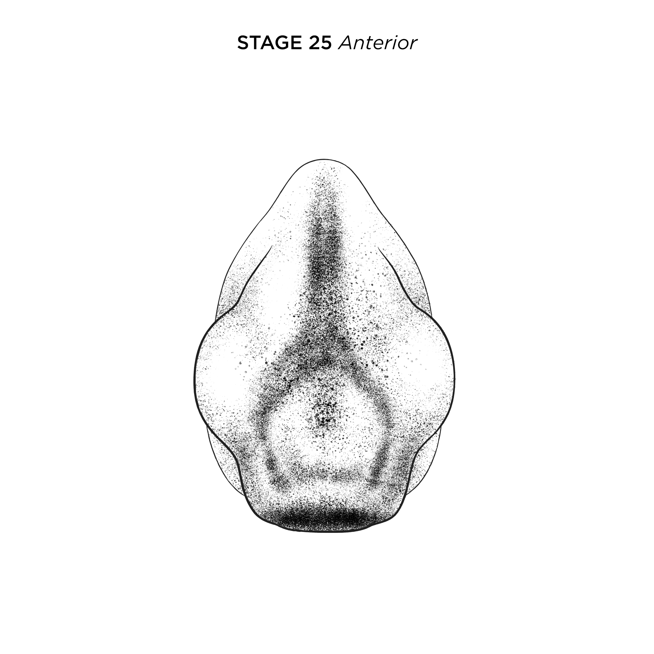 Xenopus laevis embryo at NF stage 25, anterior view, dorsal up. Scale bar= 1mm. Illustration © 2021 Natalya Zahn, CC BY-NC 4.0. |