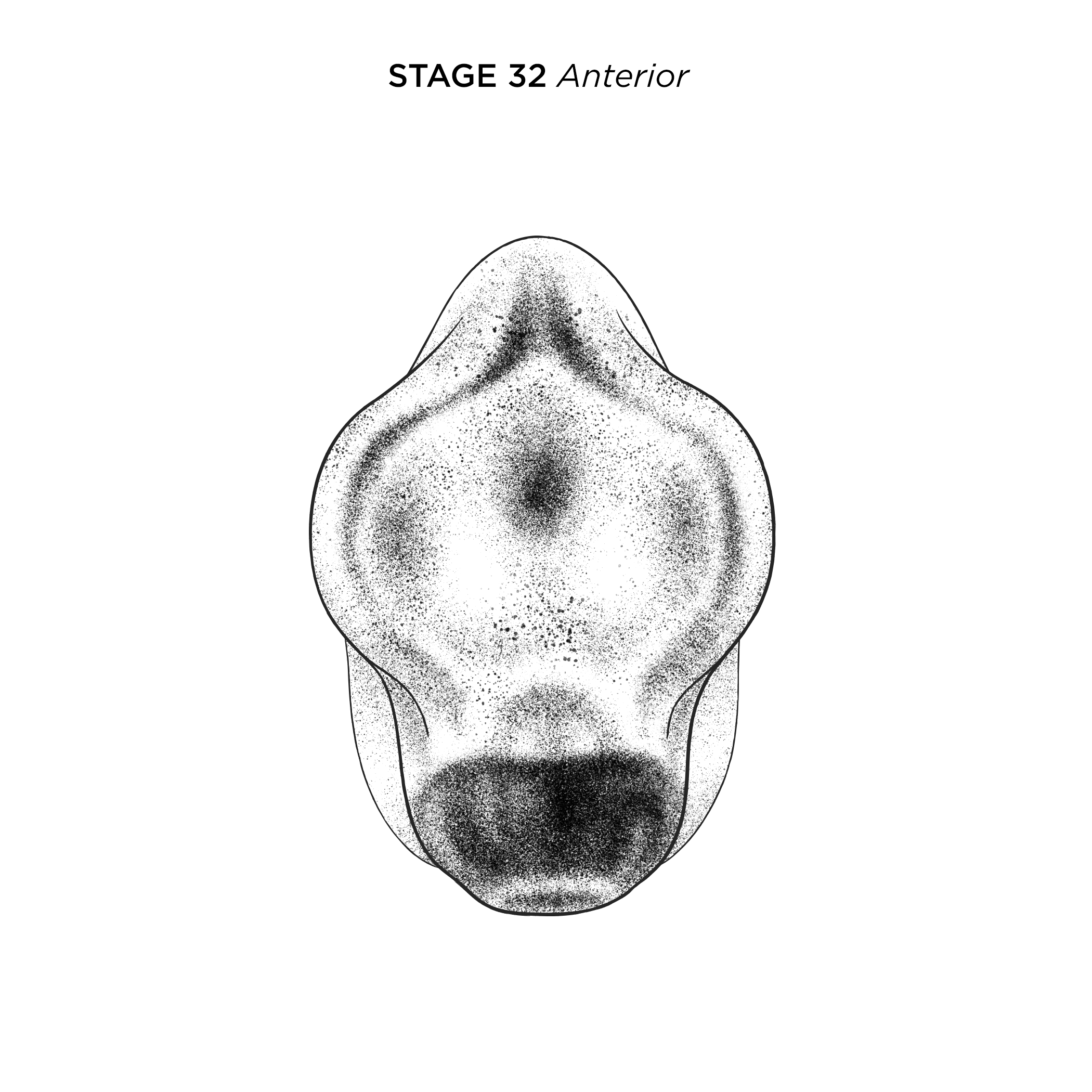 Xenopus laevis embryo at NF stage 32, anterior view, dorsal up. Scale bar= 1mm. Illustration © 2021 Natalya Zahn, CC BY-NC 4.0. |