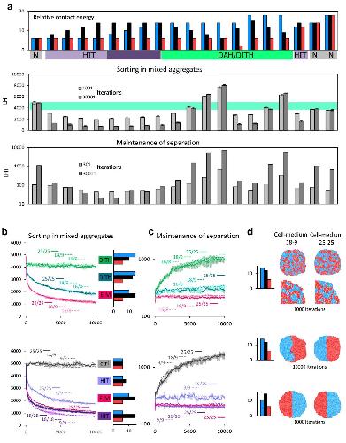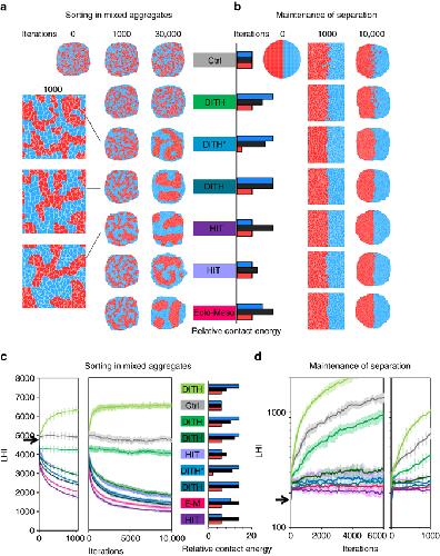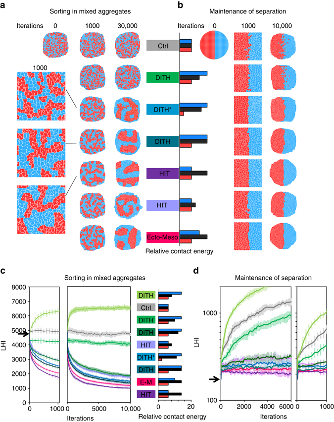 Fig. 6. Model simulations of cell sorting and tissue separation. Simulations of sorting from a mixed aggregate (a, c) and of maintenance of a boundary interface (b, d). a, b Representative snapshots at the indicated number of iterations. Rectangular images represent enlargements of a portion of the aggregates. Initial matrices are shown at 0 iteration. c, d Evolution of LHI used as an index for cell sorting and for maintenance of separation. Small panels show details of the first 1000 iterations. The curves represent the average of 15, respectively, 8, independent simulations. Error bars: s.d. In the case of mixed aggregates, each simulation started from a different initial matrix of randomly distributed cells. The same sets of relative contact energies were used for both types of situations. DITH scenarios differ in terms of the relative heterotypic interfacial energy, set at 25, 50, 75 and 100% of the difference between the homotypic tension energies of the two cell populations. DITH* corresponds to the previously published conditions37; HIT conditions were set with identical homotypic energies in both cell types, and a higher interfacial tension; ectoderm–mesoderm (E–M) energies were based on estimated relative tensions in the Xenopus system. Cell to medium values were set as follows: a, b 25 for both cell types, all conditions. In graphs c and d, unequal values 18/9 for all conditions except for the two HIT conditions, where they were set equal, respectively, 9/9 and 18/18. Varying cell to medium values had little impact on sorting and separation (see systematic comparisons in Supplementary Fig. 8b–g) |