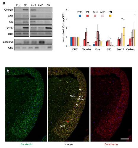 Supplementary Figure 1 | Characterization of induced mesoderm. (a) Characterization of dissected tissues by RT-PCR. Cerberus is a marker for anterior mesendoderm, Gsc, and Chordin for prechordal mesoderm, Xbra for chordal mesoderm, Sox17 is enriched in the endoderm, but also expressed at lower levels in the mesoderm. Ubiquitously expressed ODC was used as a standard. Quantification is from 3 independent experiments. Error bars are s.d. (b) C-cadherin (red) and β-catenin (green) immunostaining in the gastrula embryo. Nuclei were stained with Hoechst (blue). BCR (Ecto), ectoderm blastocoel roof; AME, anterior mesendoderm; AxM, axial mesoderm. Arrowheads point to the ectoderm-mesoderm boundary. The axial mesoderm is still mostly at the blastopore lip, but starts to participate to the nascent boundary (red arrowhead) and already displays separation activity from ectoderm in vitro 1. |