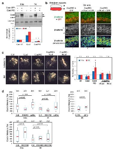 Supplementary Figure 2 | Experimental manipulation adhesion and actomyosin contractility. (a) Cadherin overexpression and depletion. Comparison by immunoblot of C-cadherin protein levels in control tissues and tissues from embryos injected with C-cadherin-GFP mRNA or C-Cadherin MO. Arrow, endogenous C-cadherin; arrowhead: Ccadherin-GFP. Quantification was performed from three independent experiments. Individual comparisons were done using Games-Howell test (* P<0.05) after a significant One-way Welch ANOVA (P<0.0001; unequal variances). Error bars are s.d. (b) Validation of cadherin depletion and replacement. C-cadherin was depleted by MO injection and replaced with E- or N-cadherin by co-injection of the corresponding mRNA. GFP mRNA was co-injected as a tracer. Manipulated ectoderm explants were juxtaposed to wild type non-injected ectoderm explants for direct comparison of β-catenin membrane immunostaining, used as a general marker for cadherin-based adhesive structures. Pseudocolors were added to help visualizing the decrease of β-catenin signal caused by CadMO and the rescue by expression of E- or N-cadherin. Numbers of samples indicated at the bottom. Scale bar, 30μm. (c) Effect of C-cadherin overexpression, depletion, and replacement on ectoderm and mesoderm cohesion. The same conditions as in (b) were tested for resistance to dissociation. Graph shows mean values and error bars are s.d. Number of experiments is given above the graph. Individual comparisons were done using Games-Howell test (* P<0.05) after a significant one-way Welch ANOVA P<0.0001; for unequal variances). (d) Manipulation of cortical contractility. Top left panel: Effect of MHC2A+B depletion (MHCMOs) and Rho activation (caRhoA mRNA) on the elastic modulus of ectoderm and induced mesoderm cells. Data are from 5 independent experiments. Right: Effect of Eph stimulation by soluble ephrinB3-Fc ligand. Lower left: Single myosin isoform depletion (MHC2A or MHC2B MO) did not cause a decrease in elastic modulus, suggesting that each isoform is able to compensate for the loss of the other. Box plots as in main Fig.2e. The number of cells tested/independent experiment is above the graph. Individual comparisons were done using Tukeyâs Hs.d test after a significant One-way ANOVA (P=5.7e-08). |