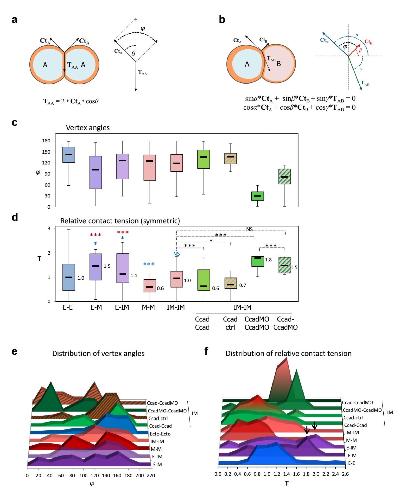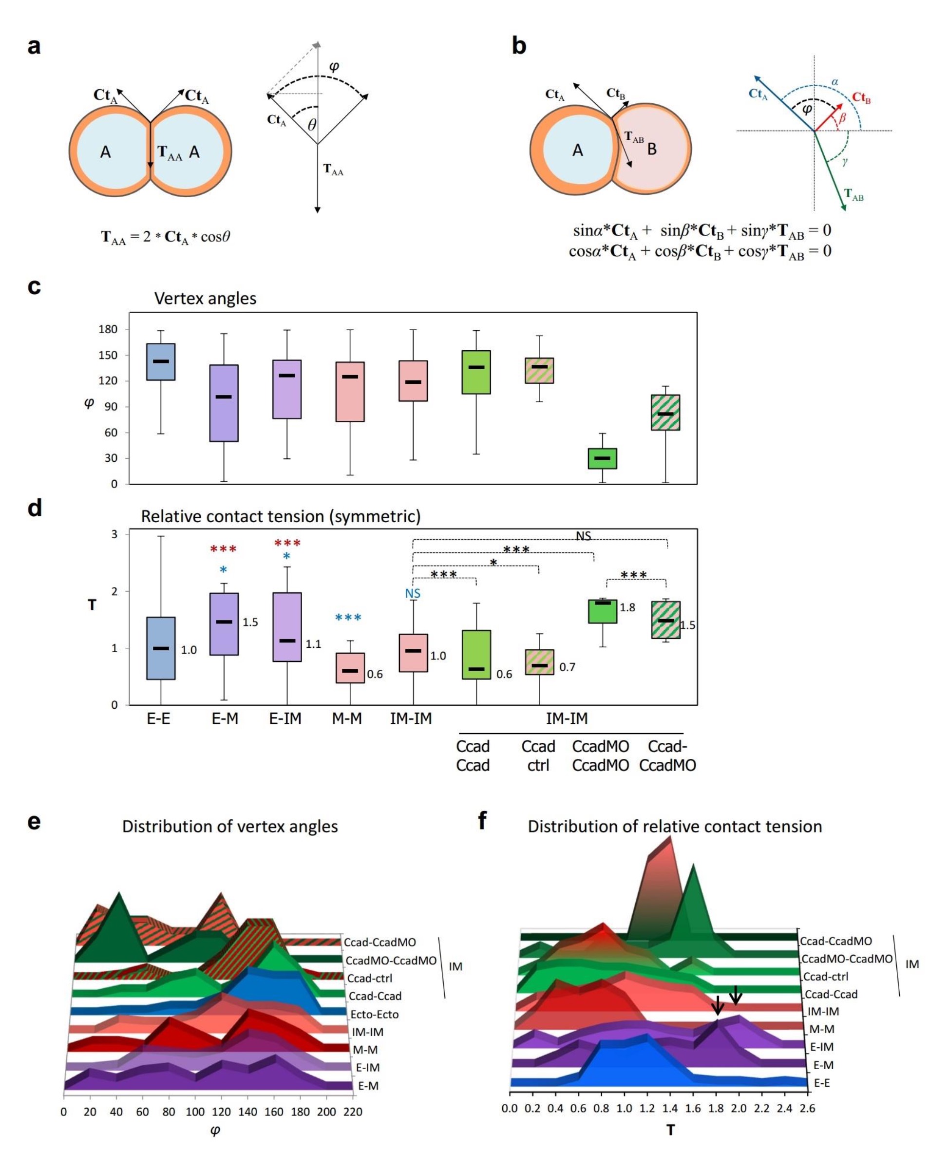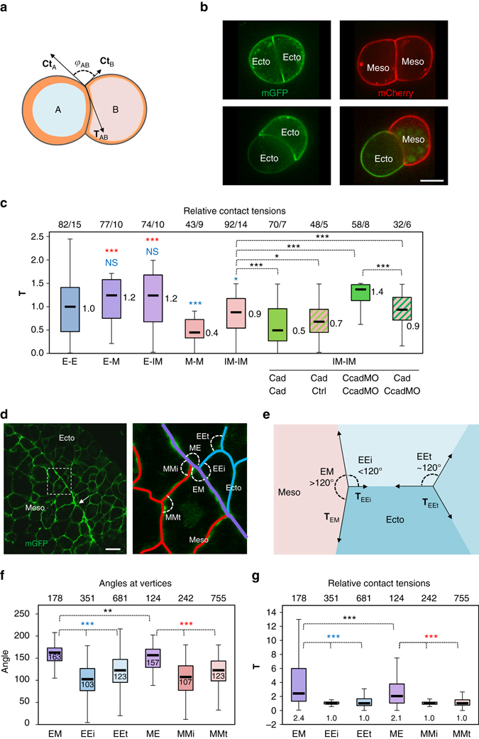 Fig. 3. Estimates of relative contact tensions. aâc Estimates based on the geometry of cell doublets. a Diagram of cell doublet, representing the balance between Ct A, Ct B and T Ab. Ï AB is the angle formed between Ct A and Ct B. The orange layer symbolises the actomyosin cortex. A curved cellâcell interface reflects unequal Ct A and Ct B tensions. b Examples of homotypic and heterotypic doublets, expressing membrane-targeted GFP or Cherry. Scale bar, 15âµm. c Relative T for different types of doublets, calculated based on measurements of angles at vertices and on the Ct values obtained by AFM (Fig. 2e) (detailed calculation in Supplementary Methods). E ectoderm, M mesoderm, IM induced mesoderm. Also shown combinations of IM doublets made of control (ctrl), cadherin-overexpressing (Cad) or cadherin-depleted cells (CcadMO). Box plot as above. The numbers on top of the graph are number of measured angles/number of experiments. Individual comparisons were done using one-sided Studentâs t-test. *Pâ<â0.05, **Pâ<â0.01, ***Pâ<â0.001, NS not significant. A colour code was used to indicate comparison to control mesoderm (red) or to ectoderm (blue). dâg Estimates based on the geometry of cells within tissues. d Section of dorsal ectoderm and mesoderm expressing mGFP. Right panel: Enlargement of the boundary area, with homophilic contacts highlighted in blue and red, and the heterophilic boundary interface in purple. Angles formed at vertices between different types are indicated: EM and ME, angles between heterotypic contacts; EEi and MMi, angles between heterotypic and homotypic contacts at the tissue interface; EEt and MMt, angles between homotypic contacts inside each tissue. Scale bar, 30âµm. e Representation of vector forces at vertices. Angles at a vertex within an ideal homogenous tissue should be around 120°. Tissue boundaries tend to be straighter, thus, EM and ME angles are larger than EEi and MMi angles. Such asymmetry is indicative of higher contact tension. f, g Angle measurements and calculated relative T (Supplementary Methods). T at heterotypic contacts is about twice as high as at homotypic contacts. Measurements from 12 embryos. Plots and statistics with colour code as above |