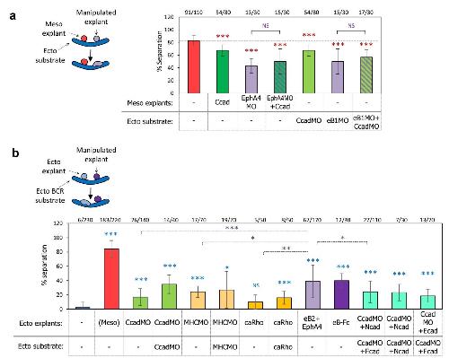Fig. 4. Impact of adhesive and contractile difference on ectodermâmesoderm separation. a Scheme of the separation assay. Embryos injected at the 2 cell-stage were dissected at the early gastrula stage. Explants were laid on a BCR, and the number of explants remaining separated were scored. b Maintenance of ectodermâmesoderm separation. Cellâcell adhesion was levelled by C-cadherin depletion in the ectoderm (morpholino injection, CcadMO), or overexpression in the mesoderm (mRNA injection, Ccad). Differences in contractility were levelled by depletion of MHC2A and B in the ectoderm (MHCMO) or by expression of constitutively active RhoA (mRNA injection, caRho) in the mesoderm. Ephrin-Eph signalling was inhibited by depletion of ephrinB1 (eB1MO) or EphA4 (A4MO), respectively, in the ectoderm or the mesoderm. c Example of the assay using a blastocoel roof induced to mesoderm as substrate (IMBCR). Ectoderm explants remain separated, whereas mesoderm explants sink into the IMBCR. d Induction of separation between mesoderm explants and IMBCR. Differences in cellâcell adhesion were imposed by C-cadherin overexpression (Ccad) and differences in contractility by expression of caRho. Ephrin-Eph signalling was stimulated by expression of ephrinB1 and B3 and simultaneous depletion of EphA4. Alternatively, signalling was activated at the surface of the mesoderm explants using preclustered ephrinB3-Fc soluble fragments (eB-Fc). Differences in cadherin expression were created by C-cadherin depletion (CcadMO) and its replacement with E-cadherin on one side and with N-cadherin on the other side. Ectoderm explants were used as a positive control (blue column). In an additional control, myosin activity was increased in both explant and substrate (caRho). The numbers on top corresponds to the number of explants that remained separated/total explants (10 explants per independent replicate). Graphs show mean values, error bars s.d. Individual comparisons to control mesoderm (red asterisks) were done using one-sided Studentâs t-test |