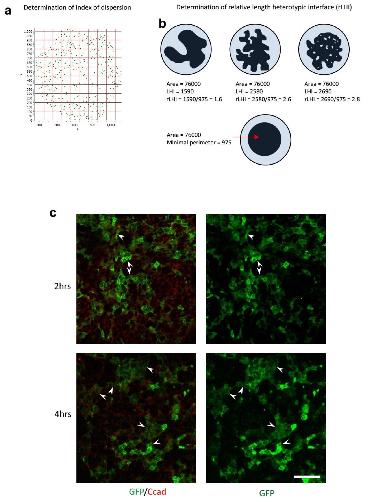 Supplementary Figure 6 | Reaggregation assay. (a) Example of grid used to measure the index of dispersion, here of a negative control aggregate. The green spots correspond to the positions of the labelled nuclei. (b) Principle of measurement of the relative length of heterotypic interface used to quantify the degree of separation in the reaggregation experiments of Fig.5: The diagrams represent symbolized aggregates (light blue circles) in which the labelled cells occupy the same area (black surface), but with different distributions. These illustrations show how LHI can be increased by irregular/convoluted interfaces (center) and by incomplete sorting of single or small groups of cells (right). Real aggregates varied in terms of size and of the relative number of cells of the two populations. In order to standardize their LHI, we calculated for each aggregate the theoretical minimal interface, i.e. the perimeter of a circle corresponding to the total surface of the labelled cells (lower diagrman). The relative LHI (rLHI) was defined as LHI divided by this minimal perimeter. Note that the complementary calculations based on the surface of the unlabeled cell population gave similar results (not shown). (c) Intermediate stages of reaggregation. Images of mixed ectoderm-IM aggregates fixed after 2 and 4 hrs. IM cells expressed GFP. Cryosections were immunostained for GFP (green) and β-catenin (red), as general marker of cell outlines. Left panel, merged images; right panels, green channel. Segregation starts by formation a small clusters, which will later coalesce in large groups. Even at these early stages, tissue segregation is detectable at a small scale by the presence of smooth heterotypic interfaces (arrowheads). Scale bar 200μm. |