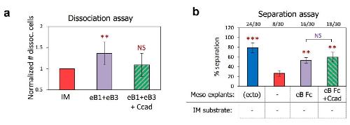 Supplementary Figure 9 | Combined effects of cadherin expression and ephrin signaling. (a) Dissociation assay showing decreased cell-cell adhesion for mesoderm explants upon ephrin ectopic expression and rescue by C-cadherin coexpression. Results are average from eight independent experiments. (b) Separation of mesoderm tissues induced by treatment of the explants with soluble ephrin-Fc is not sensitive to C-cadherin overexpression. Numbers on top correspond to separated/total number of explants, from three experiments. Studentâs t-test, color code as above. |