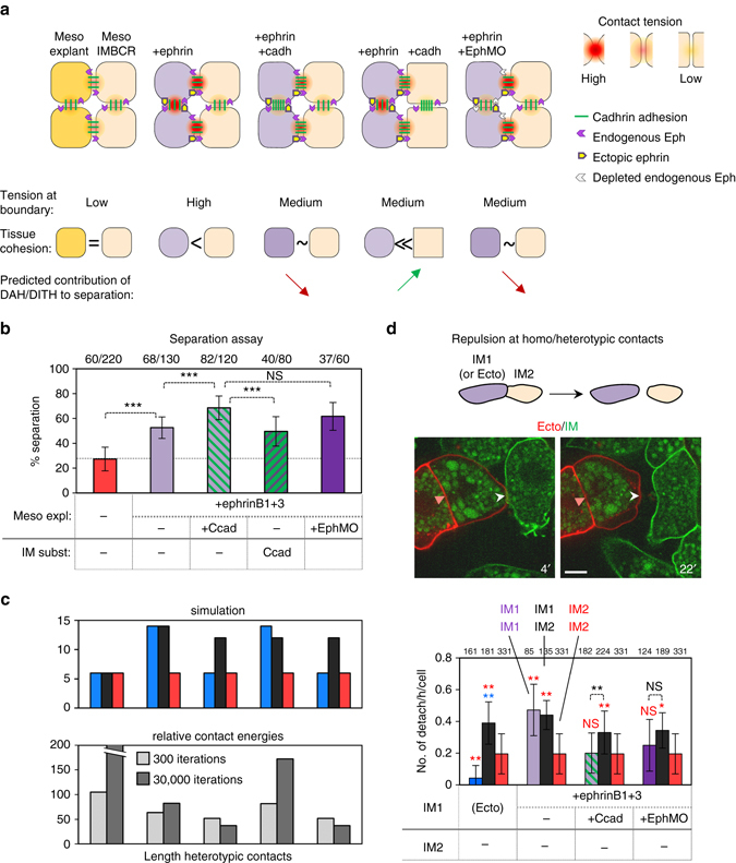 Fig. 7. Combined effects of tissue cohesion and ephrin-Eph signalling on separation. a Graphic representation of the various conditions tested in this experiment. The upper diagrams represent the various cell contacts with the tension resulting from the antagonistic action of cadherins and ephrin-Eph receptor pairs. The strength of the contact tension is also reflected in the shape of the cells (rounder outlines correspond to higher tension). The lower part of the panel summarises the impact of each manipulation on heterotypic interfacial tension and on tissue cohesion (inversely related to homotypic contact tension), and the predicted effect on separation assuming a contribution of DAH/DITH. Normal mesodermâmesoderm contacts have low contact tension. Ephrin ectopic expression stimulates repulsion both at the explant interface and within the explant, resulting in higher tension at both homotypic and heterotypic contacts. Cadherin overexpression in the explant counteracts ephrin-induced repulsion within the explant, and to a lesser degree at the interface. Cadherin expression on the other side of the boundary decreases tension in the IMBCR, thus enhancing the difference in homotypic tension of the two tissues. EphA4 depletion (EphMO) in the explant reduces ephrin-induced repulsion within the explant (and to a lesser extent at the interface). b Result of the separation assay (graph and statistics as in Fig. 4). Ephrin-induced separation was stimulated by cadherin co-expression or Eph depletion, inconsistent with a contribution of DITH. c Simulation of maintenance of separation for each experimental condition. Energy values were based on the results shown in d. The results of the simulation were in agreement with the experimental data. d Cellâcell repulsion quantified as the hourly rate of cell detachment. Top: Diagram of the experiment. Middle: Two frames of a time-lapse confocal microscopy movie. Ectoderm and IM cells expressed, respectively, membrane Cherry and membrane GFP. The pink arrowheads point to a stable homotypic contact, the white arrowheads to a heterotypic contact that detached. Scale bar, 10âµm. Bottom: Quantification of detachments at homotypic (blue/purple and red columns) and heterotypic contacts (black columns). Statistical comparisons to ectoderm or mesoderm controls are colour coded as above |