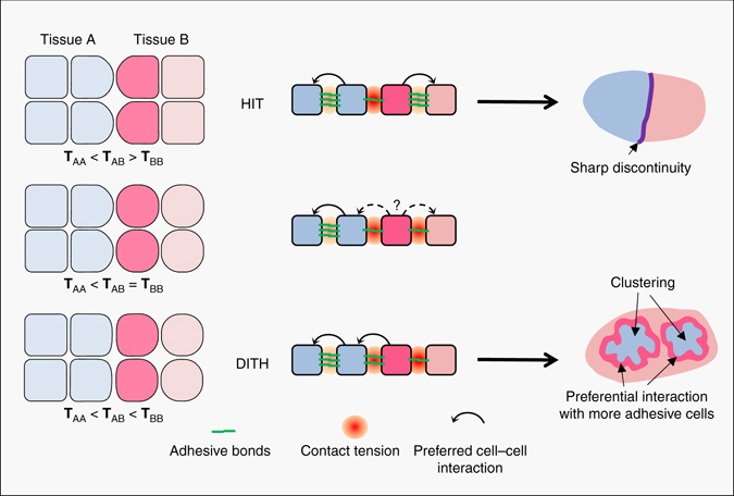 Fig. 8. Summary diagram comparing HIT and DITH situations. Two cell types A and B are represented in blue and pink. B-type cells abutting A-type cells are in darker pink. In a HIT situation (top), where heterotypic contact tension T AB is higher than the two homotypic tensions, cells tend to establish more stable contacts with sibling cells of the same type. At the tissue scale, this drives full segregation of the two cell populations separated by a sharp boundary. In a classical DITH situation (bottom), blue A-type cells will be able to cluster, but for dark pink B-type cells, heterotypic contacts may be more stable than homotypic contacts, thus these cells will tend to preferentially interact with the less tensile/more adhesive A-type cells, a situation that will not lead to clean segregation of the two cell populations. The middle row illustrates an intermediate situation, where separation may still be achieved provided a sufficiently strong difference between T AB and T AA |