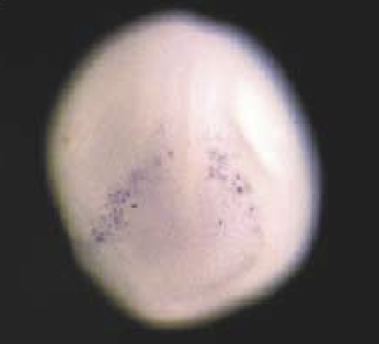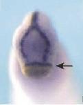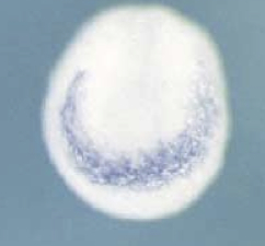 gene expression in Xenopus laevis embryo, assayed via in situ hybridization, NF stage 22, anterior view, dorsal up. |