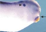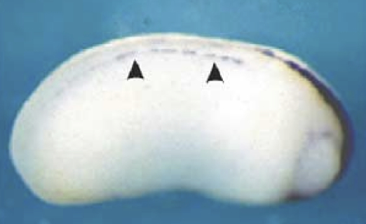 loc398404 (ras-related protein ras-dva ) gene expression in Xenopus laevis embryo, assayed via in situ hybridization, NF stage 25, lateral view, anterior right, dorsal up. Arrows indicated expression in lateral portions of neural tube. |