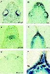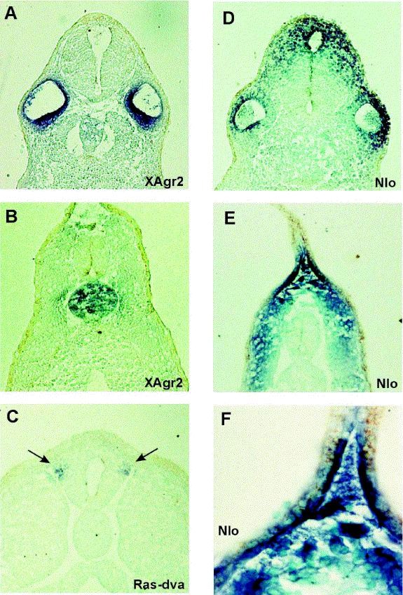 Fig. 4. Transverse sections of embryos stained for XAgr2 (A,B), Ras-dva (C), and Nlo (DâF) expression. (A) A transverse section of the stage 32 embryo; XAgr2 is expressed in the ventromedial part of otic vesicle. (B) XAgr2 is expressed in the notochord. (C) Ras-dva is expressed in the dorsolateral parts of neural tube at the stage 25 (arrows). (D) A transverse section of the stage 32 embryo; Nlo is expressed in the dorsolateral part of otic vesicle. Nlo is expressed by (E) the basal cells of dorsal fin, and (F) by migrating neural crest cells. |