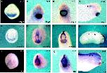 Fig. 2. Expression patterns of the novel genes in anterior ectoderm during normal development. XAgr2 expression at the midneurula stage 15 (A), tailbud stages 28 (B), and 32 (C,D: lateral view). At the stage 32, XAgr2 is expressed in the cells surrounding the cement gland and in the otic vesicle (D, arrowhead). Ras-dva expression at the midneurula stage 15 (E), stage 22 (F), and tailbud stage 25 (F,H: lateral view). At stage 25, Ras-dva expression disappears from the center of developing cement gland, remains in the hatching gland, and starts in the lateral parts of neural tube (H, arrowheads). Nlo expression at the midneurula stage 16 (I), tailbud stages 24 (J), and 27 (K,L: lateral view). At stage 24, Nlo is expressed in the hatching gland (J). At stage 27, Nlo is also expressed in the stripe of cells above the cement gland (K,L, arrows). At stage 32, Nlo is expressed in the otic vesicles (L, arrowhead). |