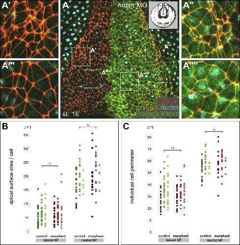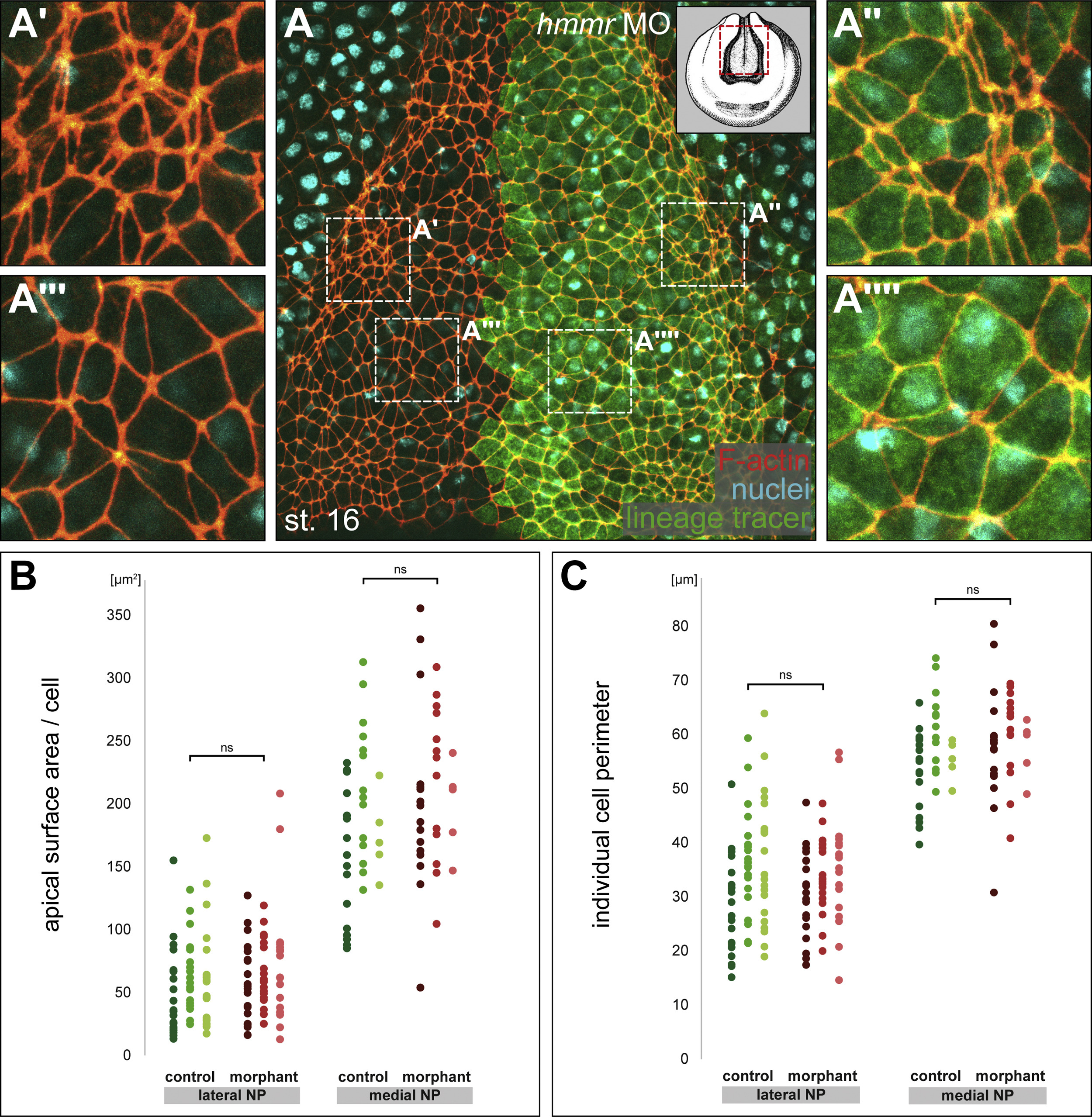 Fig. S2. Apical constriction is not disturbed inhmmrmorphants. (A) View onto the surface of superficial cells in anterior neural plate (NP) at stage (st.) 16 of an embryo unilaterally injected with hmmr morpholino (MO) into one dorsal animal blastomere at the eight cell stage. Phalloidin staining detecting F-actin marks cell borders (red); DNA staining by Hoechst 33342 detects nuclei (cyan), fluorescent lineage tracer in green. (Aâ-Aââââ) Magnification of lateral (Aâ, Aââ) and medial (Aâââ, Aââââ) areas of the NP as indicated by white boxes in (A). (B, C) Measurements of apical surface area per cell (B) and individual cell perimeter (C). Note that apical constriction (AC) is unaltered between control and morphant cells. Except for one case, 20 cells in a total of three embryos were analyzed. ns, not significant. |