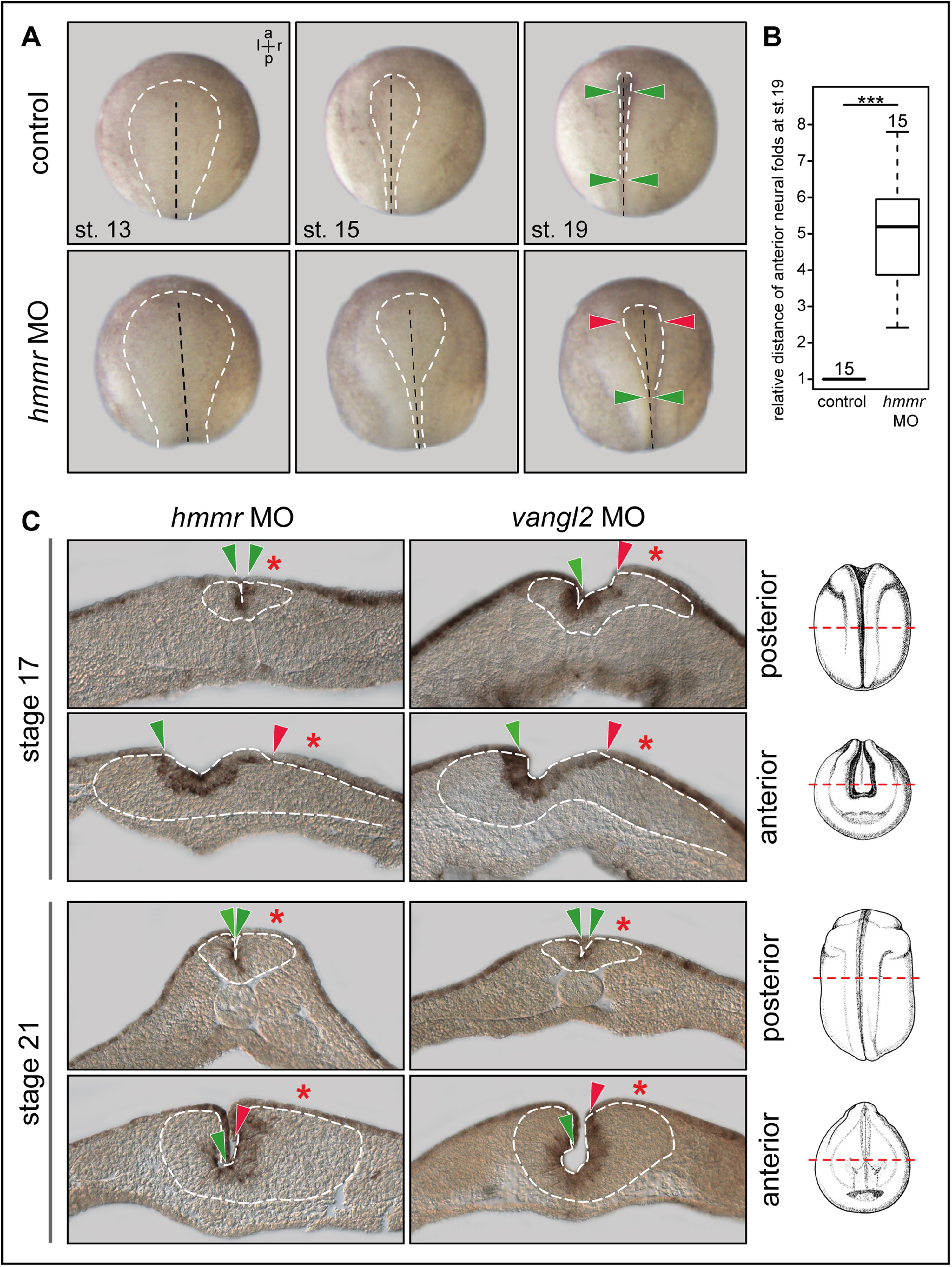 Fig. 2. Anterior neural tube closure defects inhmmrmorphants. (A) Single frames from time-lapse movie during neurulation of embryos injected into both dorsal animal blastomeres with control morpholino (MO) or hmmr MO. Three different time points corresponding to control stages (st.) 13, 15 and 19 are shown in dorso-anterior views. Dashed white lines mark the border between superficial neural and non-neural ectoderm, dashed black lines indicate midline. Green arrowheads indicate wildtype distance of neural folds, red arrowheads indicate increased anterior neural fold distance in morphants. (B) Statistical analysis of anterior neural fold distance relative to control at st. 19. Number of embryos indicated above each plot. (C) Transverse histological sections of posterior or anterior neural tissue at st. 17 or 21 of embryos injected unilaterally into a single dorsal animal blastomere (injected side indicated by asterisk) with hmmr MO or vangl2 MO. Borders of neural tissue are marked in white. Wildtype or aberrant neural fold convergence indicated by green or red arrowheads, respectively. |