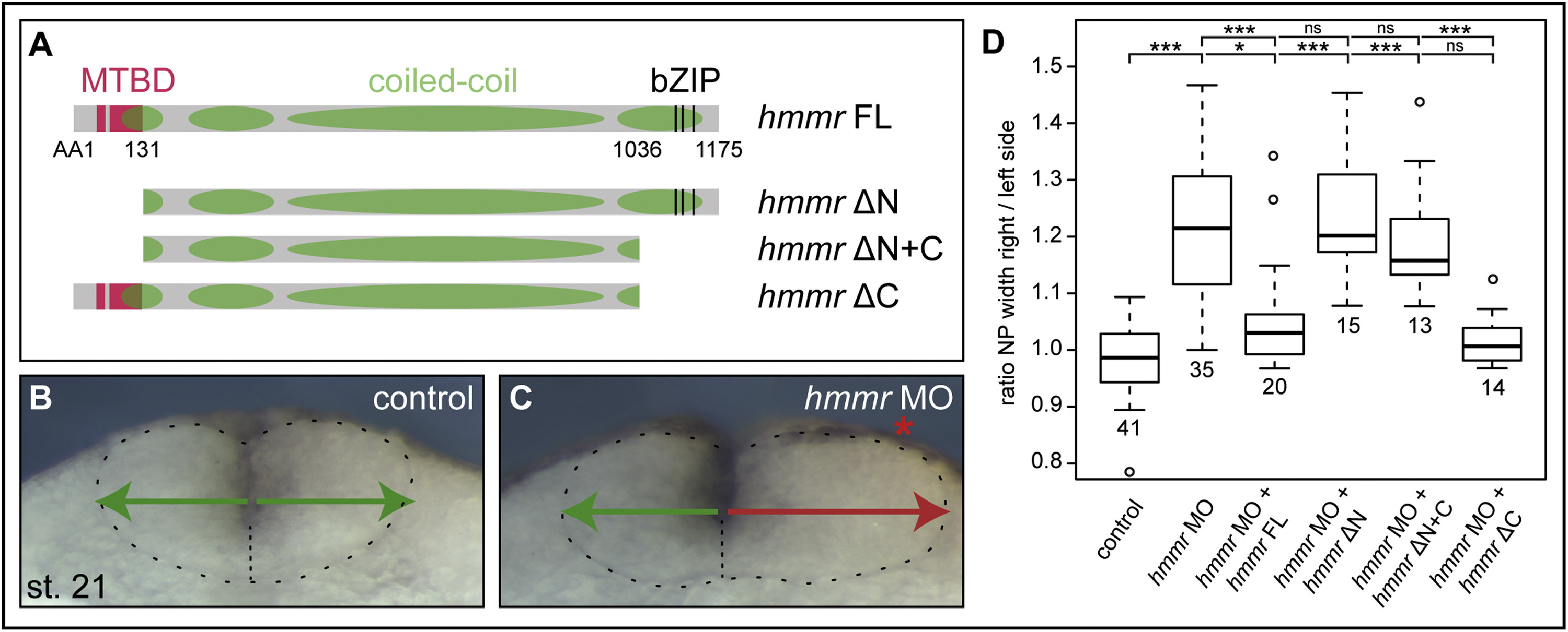 Fig. 3. Anterior neural tube morphogenesis requires thehmmrmicrotubule binding domains. (A) Schematic representation of hmmr full length (FL) and deletion (δ) constructs lacking amino- (δN) or carboxy-terminal (δC) amino acids (AA) or both (δN+C). MTBD, microtubule binding domain. (B, C) Control embryo (B) and embryo injected unilaterally with hmmr morpholino (MO) into the right dorsal animal blastomere at the eight cell stage (st.; injected side marked by asterisk; C) and bisected transversally at the forebrain level at st. 21, views onto cut surfaces. Dashed black lines mark border of neural tissue and indicate the midline. Wildtype neural tissue width depicted by green arrow, widened neural tissue by red arrow. (D) Statistical analysis of neural tissue width upon injection of hmmr MO and deletion constructs. Note that presence of the MTBDs is required for rescue of tissue narrowing. Number of embryos indicated for each plot. ns, not significant. |