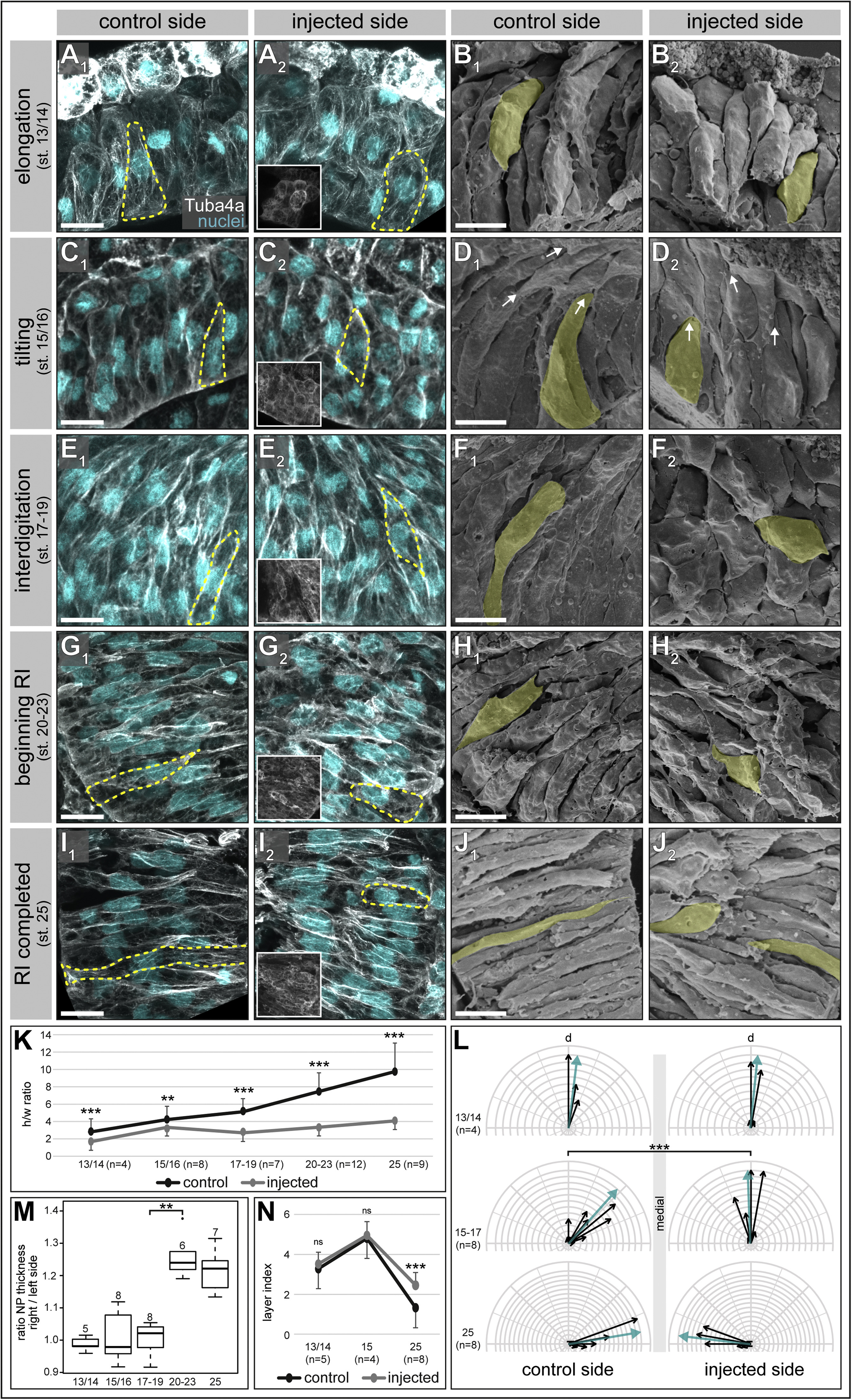 Fig. 5. hmmr impairs radial intercalation upon anterior neural tube closure. (A-J) Immunolabeling of α-tubulin (Tuba4a; A, C, E, G, I) and scanning electron microscopy (B, D, F, H, J) reveal progressive microtubule cytoskeleton polarization and cell morphology changes during neurulation in the anterior neuroectoderm (ANE) of embryos injected unilaterally with hmmr MO at the eight cell stage (st.). Dashed lines and color shading reveal cell shapes. Insets in (A2, C2, E2, G2, I2) demonstrate lineage tracer fluorescence in the respective area. Scale bars: 20 µm. (K) Analysis of the height / width (h / w) ratio of deep ANE cells. Note progressive elongation in control vs. failure to elongate in morphant cells. (L) Tilting of ANE cells as measured by angular displacement of cell apices, indicated by arrows in (D1, D2). Note that cells are initially aligned along the dorsal (d) to ventral axis and progressively tilt medially. Angles are binned in ten degree steps. Blue arrows indicate average angle of tilting, one concentric circle equals a frequency of one cell tilted in this direction. (M) ANE thickness as measured from apical side of superficial cells to basal side of adjacent deep cells; ratio between injected and control side reveals that loss of hmmr affects the ANE from st. 20 onwards. (N) Calculation of a layer index (Keller, 1980) shows failure of radial intercalation in morphant ANE. Note that layer analysis was impeded between st. 15 and 25 due to the complex interdigitation of individual cells. Numbers of specimens analyzed are indicated in each plot. Five cells were analyzed per specimen. ns, not significant. |