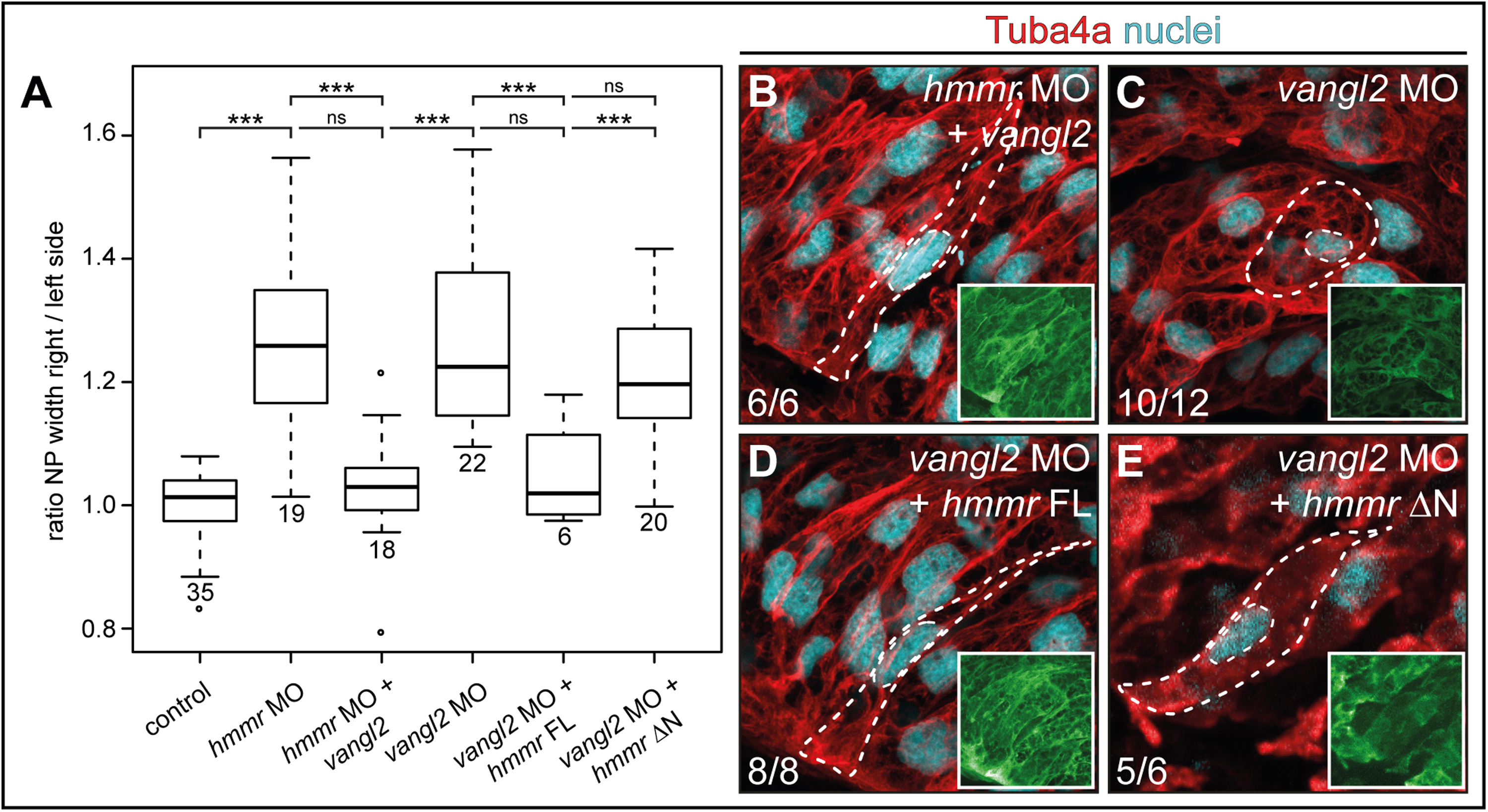 Fig. 6. hmmr and vangl2 interact during anterior neural morphogenesis. Reciprocal rescue of anterior neural morphogenesis and cell polarity defects in hmmr and vangl2 morphants. Embryos at the eight cell stage (st.) were injected into the right dorsal animal blastomere with morpholinos (MO) and mRNA as indicated and analyzed at st. 21. (A) Anterior neural morphogenesis. Statistical analysis of neural tissue width (cf. Fig. 3). ns, not significant; number of embryos analyzed indicated for each plot. Note that hmmr and vangl2 interaction in mediating neural tissue narrowing requires the N-terminal microtubule (MT) binding domains of hmmr. (B-E) Neural cell polarity. Comparison of cell shape (indicated with white dashed lines) and MT organization (Tuba4a, red). Insets demonstrate lineage tracer fluorescence in the respective area. Frequency of phenotypes indicated in each panel. Note that despite the failure to rescue tissue narrowing (A), hmmr δN re-establishes cell polarization (E). |