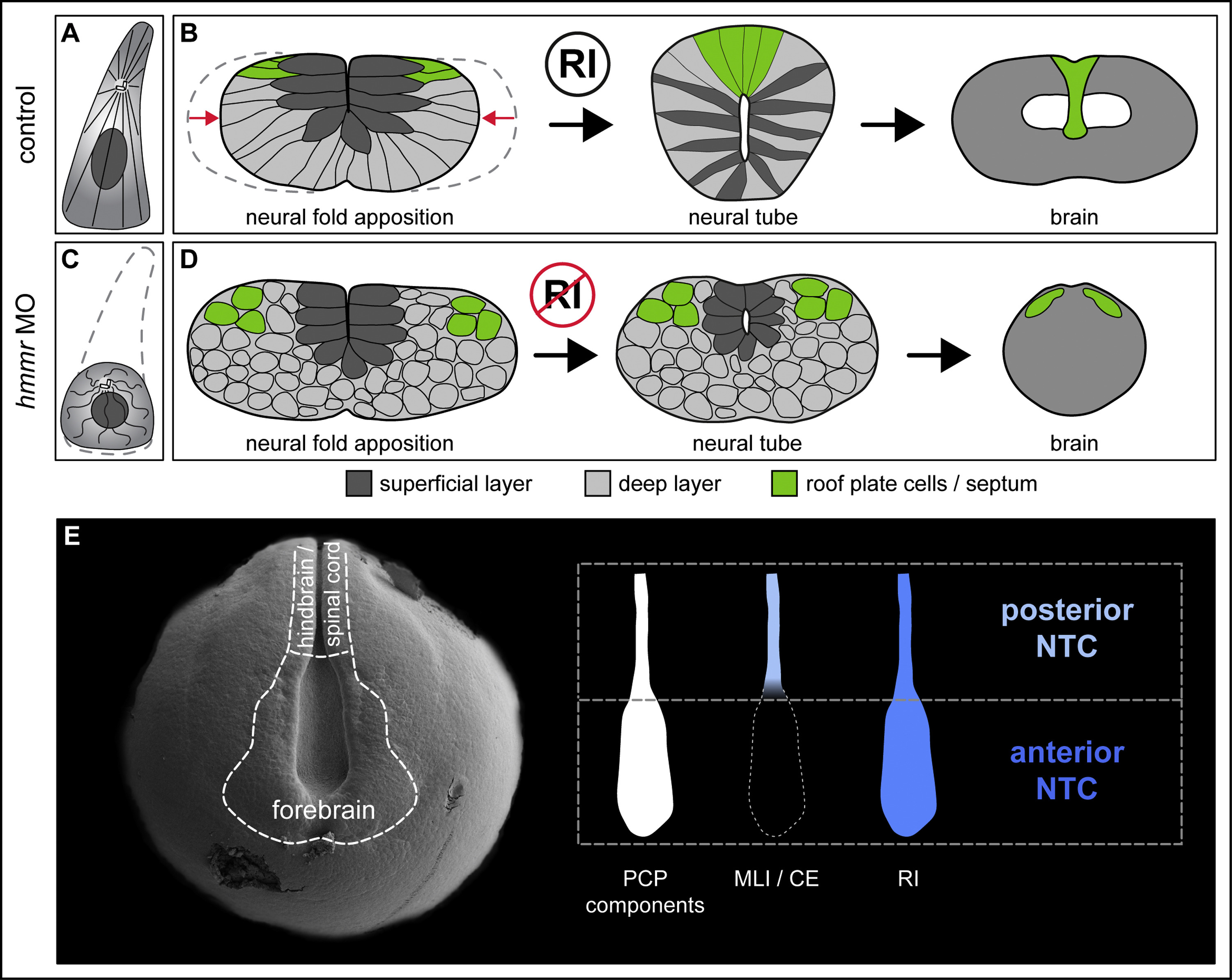 Fig. 7. Hypothetical model ofhmmr functionduring anterior neural tube closure. (A) Elongated cell with polarized microtubule (MT) cytoskeleton in control embryo. (B) During neural fold apposition, cells of the superficial (dark grey) and deep (light gray) layer interdigitate, pulling lateral cells towards the midline (Davidson and Keller, 1999). Upon neural tube closure, cells finalize radial intercalation (RI) to form a unilayered epithelium which re-establishes a ventricular lumen. Far lateral cell populations (green) are directed towards the midline to establish the roof plate (Davidson and Keller, 1999). During further brain development, the roof plate invaginates forming e.g. the septum, which separates the telencephalic hemispheres. (C) Loss of hmmr disturbs cell elongation and MT polarization. (D) During neural tube closure, RI and, consequently, narrowing of neural tissue fails. After neural tube closure, lateral cell populations remain separated which prevents formation of a functional roof plate. (E) Conspicuous morphological differences are apparent in neural tube closure between forebrain and hindbrain / spinal cord regions. PCP components in general are required along the entire anterior-posterior neural axis (white). PCP proteins mediate RI along the entire neural axis (dark blue), while their function in mediolateral intercalation and convergent extension (MLI / CE) is restricted to the hindbrain and spinal cord level (light blue). Together, the two PCP protein-driven processes MLI / CE and RI bring about posterior neural tube closure and spinal cord morphogenesis. Anterior neural tube closure and forebrain morphogenesis is facilitated by PCP protein-driven RI alone. |
