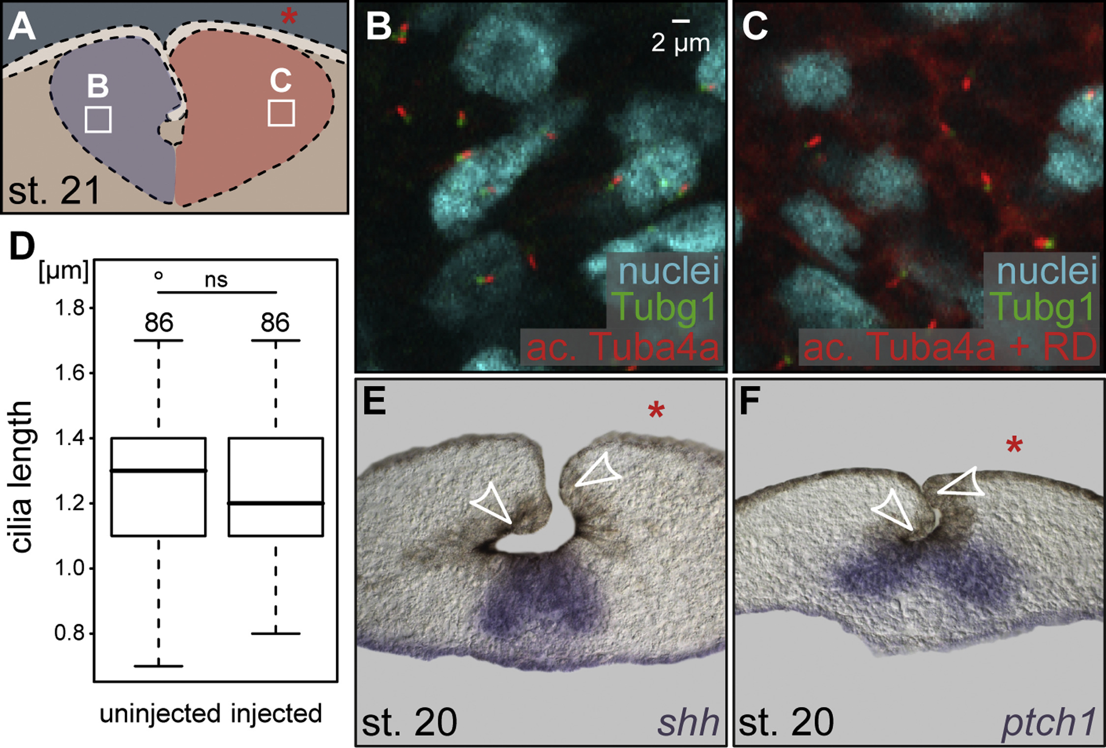 Fig. S1. Primary cilia and Shh signaling are unaffected in hmmr morphants. Embryos at the eight cell stage (st.) were injected into one dorsal animal blastomere with hmmr morpholino (MO), asterisk indicates injected side. (A) Schematic representation of a transverse hemisection of the neural tube at the forebrain level at st. 21. (B, C) Primary cilia as detected by immunofluorescent labeling of acetylated (ac.) α-tubulin (Tuba4a; red) and γ-tubulin (Tubg1; green). DNA staining by Hoechst 33342 to detect nuclei (cyan). Rhodamine-conjugated dextran was used as lineage tracer (red background in C). Z-projection of confocal laser scanning images taken on uninjected control side (B) and hmmr MO-injected side (C) as indicated in (A). (D) Statistical analysis of cilia length; ns, not significant. Number of cilia analyzed from a total of five individuals indicated above each plot. (E, F) Transversal histological sections at the diencephalon level of embryos subjected to whole-mount in situ hybridization at st. 20. Probes detecting shh (E) and ptch1 (F) show no differences in gene expression between injected and uninjected side despite obvious morphological phenotype (compare position of arrowheads indicating the border between neural and non-neural ectoderm on injected and uninjected side). |