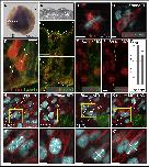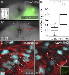 Fig. 4. Microtubule-localized Hmmr determines neural cell polarity. (A) hmmr gene expression in the stage (st.) 16 neural plate. Whole mount in situ hybridization (anterior view). (Aâ²) Transversal histological section as indicated in (A). Arrowheads point to expression in deep neural cells, delineated in white. (B-E) Hmmr protein co-localizes with microtubules (MT) in st. 21 neural cells. (B) Endogenous Hmmr (red) localizes to spindle apparatus in mitotic cells in a dotted pattern. (C) Over-expressed full length Hmmr (hmmr FL; red) localizes with MTs in a pattern typical for over-expressed MAPs. (D) Endogenous Hmmr (red) localizes along MT fibers (arrowheads) and in basal (b) MT lattice detected by anti-Tuba4a antibody (green) as well as to nuclei. (E) Endogenous Hmmr (red) localizes close to MT plus ends apically (a; E1) and basally (E2) as visualized by co-staining for EB1 (Mapre1, green). (F, G) Reduction of Hmmr in hmmr MO-injected cells. Targeted cells identified by lineage tracer (LT) fluorescence (F); LT-positive field of cells indicated by green line in (Fâ). Quantification and statistical analysis of Hmmr fluorescence, n= eight embryos (G). (H-K, Hâ-Kâ) Loss of neural cell polarity in hmmr morphants is rescued by co-expression of FL mRNA. Comparison of cell shape (indicated with white dashed lines) and MT organization (Tuba4a, red) in wildtype (H, Hâ), morphant (I, Iâ), hmmr FL (J, Jâ) and hmmr δN (K, Kâ) rescued specimens; frequency of phenotypes indicated in each panel. Insets in (I-K) demonstrate LT fluorescence in respective area. Arrows in (Hâ-Kâ) indicate elogation / rounding of nuclei. Scale bars: 5 µm. d, dorsal; l, left; r, right, v, ventral. |