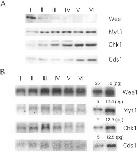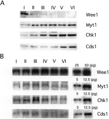 Fig. 2. Expression of negative regulators for the initiation of oocyte maturation during oogenesis. (A) Western blot analysis of Wee1, Myt1, Chk1 and Cds1. Western blotting was performed with anti-XeWee1 (Nakajo et al., 2000), anti-XeMyt1 (Nakajo et al., 2000), anti-XeChk1 (Nakajo et al., 1999) or anti-XeCds1 antibody (Gotoh et al., 2001), respectively. (B) Northern blotting analysis of Wee1, Myt1, Chk1 and Cds1. Total RNA was extracted from oocytes of each stage and the mRNA of Wee1, Myt1, Chk1 and Cds1 was detected by using each of the cDNAs as the probe. Pure Wee1, Myt1, Chk1 or Cds1 mRNA made in vitro was used as a standard for estimating the mRNA concentration. |