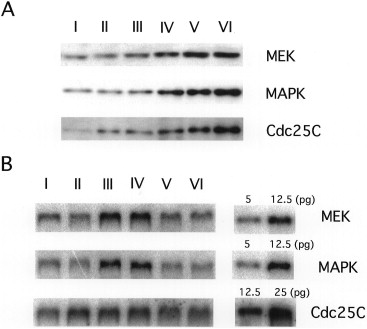 Fig. 3. Expression of positive regulators of MPF during oogenesis. (A) Western blotting analysis of Cdc25C, MEK and MAPK. Western blotting was carried out with anti-XeCdc25C (Nakajo et al., 1999), MEK (purchased from Santa Cruz) or MAPK antibody (purchased from Santa Cruz), respectively. (B) Northern blotting analysis of Cdc25C, MEK and MAPK. The mRNA of Cdc25C, MEK and MAPK was detected by using Cdc25C, MEK or MAPK cDNA as the probe. Pure MEK, MAPK or Cdc25C mRNA transcribed in vitro was used as a standard for estimating the mRNA concentration. |
