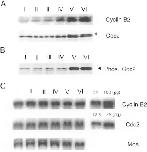 Fig. 1. Expression of Cyclin B2 and Cdc2, and pre-MPF formation during oogenesis. (A) Western blotting analysis of Cyclin B2 and Cdc2. Oocyte extracts prepared from the smallest stage I oocytes to stage VI oocytes were subjected to Western blotting analysis with anti-PSTAIR (Furuno et al., 1994) or anti-Cyclin B2 antibody (Yoshitome et al., 1998), respectively. Routinely, oocyte extracts equivalent to one half of a stage VI oocyte were used in this assay. I, II, III, IV, V and VI indicate stages I, II, III, IV, V and VI, respectively. Since the size of each stage varied widely, we chose the oocytes according to the following criteria: oocytes of stages I, II, III, IV, V and VI were about 50 μm in diameter and transparent, about 300 μm and translucent, about 500 μm and light brown, of minimum size with differentiated animal and vegetal hemispheres, about 1000 μm without a white band and 1200 μm with a white band, respectively. Cyclin B2 was detected in two forms, as previously reported in stage VI oocytes. The band indicated by a filled triangle corresponds with the phosphorylated form of Cdc2 on Thr14 and Tyr15, whose residues become phosphorylated when Cdc2 associates with Cyclin B (Solomon et al., 1990). (B) Pre-MPF formation during oogenesis. Extracts of oocytes from each stage were subjected to Western blotting with Anti-phospho-Tyr (Cdc2) (purchased from Cell Signal Technology). The phosphorylated form of Cdc2 is indicated by a filled triangle. (C) Northern blotting analysis of Cyclin B2 and Cdc2. Total RNA was extracted from 100 oocytes of stages I and II, 20 oocytes of stage III and 10 oocytes of stages IV to VI. Total RNA equivalent to that of two and a half oocytes prepared from oocytes of each stage was subjected to Northern blotting using Cdc2 or Cyclin B2 cDNA as the probe. Usually, total RNA of the same number of oocytes of the same stages is used for Northern blotting analysis or RNase protection assays (Sagata et al., 1988, Kobayashi et al., 1991, Paris et al., 1991), because the amount of rRNA is greatly increased during oogenesis. Mos mRNA was used for the loading control. The amount of this mRNA is reported to remain fairly constant during oogenesis (Sagata et al., 1988). Pure Cyclin B2 or Cdc2 mRNA transcribed in vitro was used as a standard for estimating the mRNA concentration. |