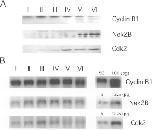Fig. 4. Expression of Cdk2, Nek2B and Cyclin B1 during oogenesis. (A) Western blotting analysis of Cdk2, Nek2B and Cyclin B1. Western blotting was performed with anti-Cyclin B1 (Yoshitome et al., 1998), Nek2B (Uto et al., 1999) or Cdk2 antibody (Furuno et al., 1997), respectively. (B) Northern blotting analysis of Cdk2, Nek2B and Cyclin B1. Total RNA extraction and Northern blotting were performed as described in Fig. 1. Each mRNA was probed by using Cyclin B1, Nek2B or Cdk2 cDNA. Pure Cyclin B1, Nek2B or Cdk2 mRNA made in vitro was used as a standard for estimating the mRNA concentration.