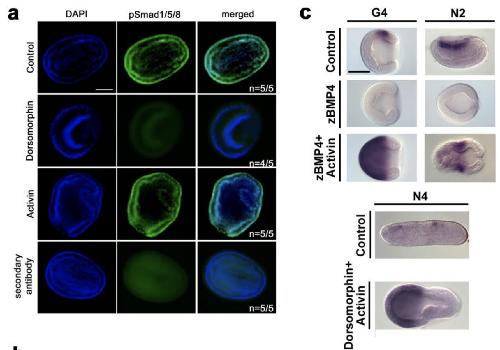 a, Immunostaining against pSmad1/5/8 and nuclear DAPI staining in control, dorsomorphintreated and Activin-treated N2 stage amphioxus embryos.