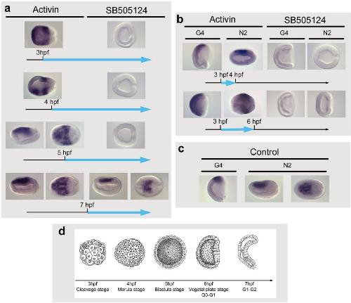 induction. a, Expression of Neurogenin at the N2 stage in embryos after continuous treatment with Activin or SB505124 from 3 hpf, 4 hpf, 5 hpf or 7 hpf at 19°C. b, Expression of Neurogenin in G4 and N2 stage embryos after treatment with Activin or SB505124 between 3 hpf and 4 hpf or between 3 hpf and 6 hpf at 19°C. c, Expression of Neurogenin in G4 and N2 control embryos. d, Drawing of amphioxus embryos at the stages at which treatments were performed, adapted from Conklin. When two pictures are presented, the left one is side view with anterior to the left and dorsal to the top whereas the right picture is dorsal view with anterior to the left. Blue arrows correspond to the period of treatment. Our results show that inhibiting the Nodal/Activin pathway via the application of SB505124 at any time between cleavage stage and G1 stage impeded the formation of Neurogenin positive neural tissue (a, cd). Moreover, one-hour treatment between cleavage stage and morula stage was also sufficient to preclude neural tissue formation (b, c-d). Conversely, treatment with Activin between cleavage stage and the beginning of gastrulation (G0-G1 stage) induced neural commitment in the whole ectoderm at G4, although neural fate was lost in the anterior region at N2 (b, c-d). In contrast, activating the Nodal/Activin pathway after the morula stage was not sufficient to neuralize all ectodermal cells (a, c-d). Altogether these results suggest that Nodal/Activin signal is required very early for neural induction to occur, and that the maintenance of the neural fate in the anterior region is also dependent upon this signal. |