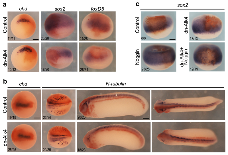 a, Expression of chd, sox2 and foxD5 at stage 10 in control embryos and in embryos injected with dnAlk4 mRNA in dorsal animal cells. Vegetal view for chd and dorsal view for sox2 and foxD5.