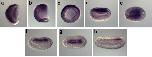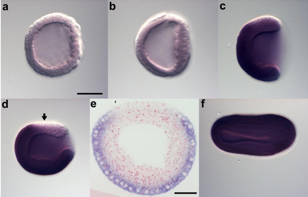 Supplementary Figure 1. K1 expression pattern. In situ hybridization of K1 at blastula (a), G1 (b), G4 (c), G6 (d-e) and N1 (f) stages. e, cross section of (d) at the level of the arrow. Whole mount in situ hybridization pictures are all side views with anterior to the left and dorsal to the top. Scale bars, 50 µm. Expression of K1 starts at the G4 stage and is restricted to
