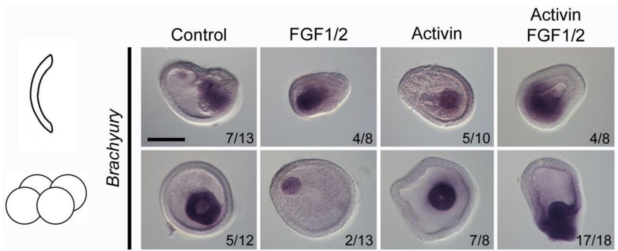 Supplementary Figure 5. Brachyury expression in explants. Brachyury expression in FGF1/2 (a, d), Activin (b, e) and Activin-FGF1/2 (c, f) treated GE and BE, respectively. In GE or BE that show inner cell mass, these cells are expressing Brachyury, in wild-type as in treated explants. Scale bar, 50 µm. |