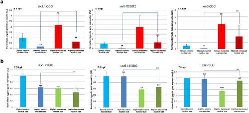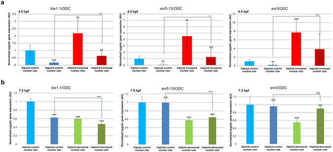 Figure 3. Quantification of zygotic transcripts by qRT-PCR in embryos with altered nuclear size and ploidy. One-cell diploid and haploid embryos were microinjected with mRNAs to increase (a) or decrease (b) nuclear size and allowed to develop to 4.5 hpf (a) or 7.5 hpf (b). Total RNA was isolated from 30 embryos for each condition and converted to cDNA. Expression levels of three zygotic genes (xnr5-13, xnr3, and bix1.1) were determined by qRT-PCR, normalized to ODC. Gene-expression levels are plotted in arbitrary units (AU) relative to control diploid embryos. The means from two independent experiments are shown. Error bars represent SD. ***pâ<â0.001; **pâ<â0.01; *pâ<â0.05; NSâ=ânot significant.