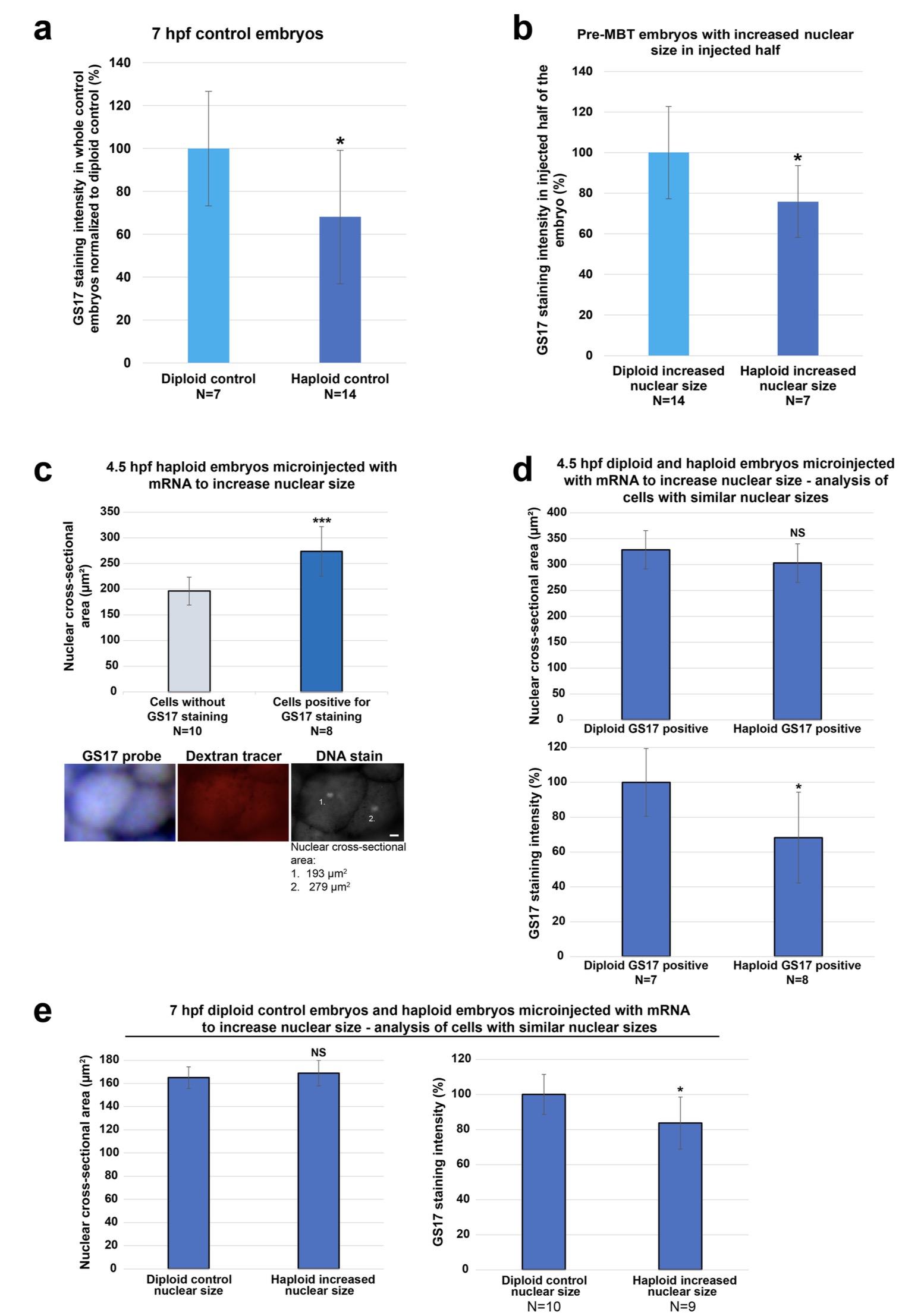(b) GS17 staining intensity was quantified in pre-MBT diploid and haploid embryo halves with increased nuclear size, and normalized to the diploid with increased nuclear size. N = number of embryos. Error bars represent SD. * p < 0.05.