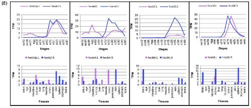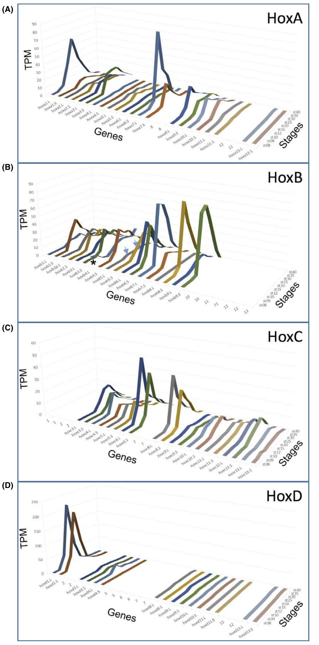 Fig. 2. Expression of hox genes. (A–D) The expression of all 76 hox genes from four pairs of Hox clusters in X. laevis was analysed byRNA-seq analyses during developmental stages (stage (st) 8–40). The average values of TPM from two clutches are plotted for eachgene. Only the PG number is indicated where there is no corresponding gene in that cluster. Between some homeologs, a large differ-ence in expression levels are observed (for example, hoxb5.L and hoxb5.S [arrows]). Note that hoxb4.L is expressed maternally (as-terisk). (E) Expression profiles during development and in adult tissues of hoxb2, hoxb4, hoxb5, and hoxb6 homeologs. Average TPMvalues are plotted. oo12: oocyte stages I and II; oo34: oocyte stages III and IV; oo56: oocyte stages V and VI; st: stage. |