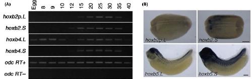 Fig. 3. Expression of hoxb2, hoxb4, and hoxb5 homeologs. (A) Expression analysis of hoxb2p.L, hoxb2.S, hoxb4.L, and hoxb4.S. RT-PCR using primers speciï¬c to each gene was performed against cDNA from eggs (egg) and stage 8â40 embryos. As controls, a house-keeping gene, odc, was ampliï¬ed using reverse-transcribed (RT+) or untreated (RT-) RNA as templates. (B) WISH analyses of hoxb2 andhoxb5 homeologs. Results for stage 20 (hoxb2 homeologs) and stage 31 (hoxb5 homeologs) are shown. The coloring reaction was per-formed for the same length of time to compare between homeologs. |