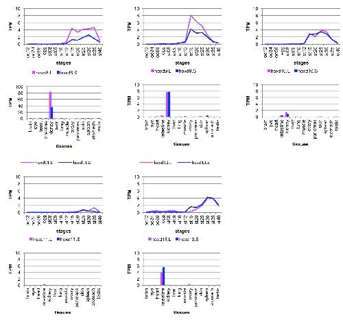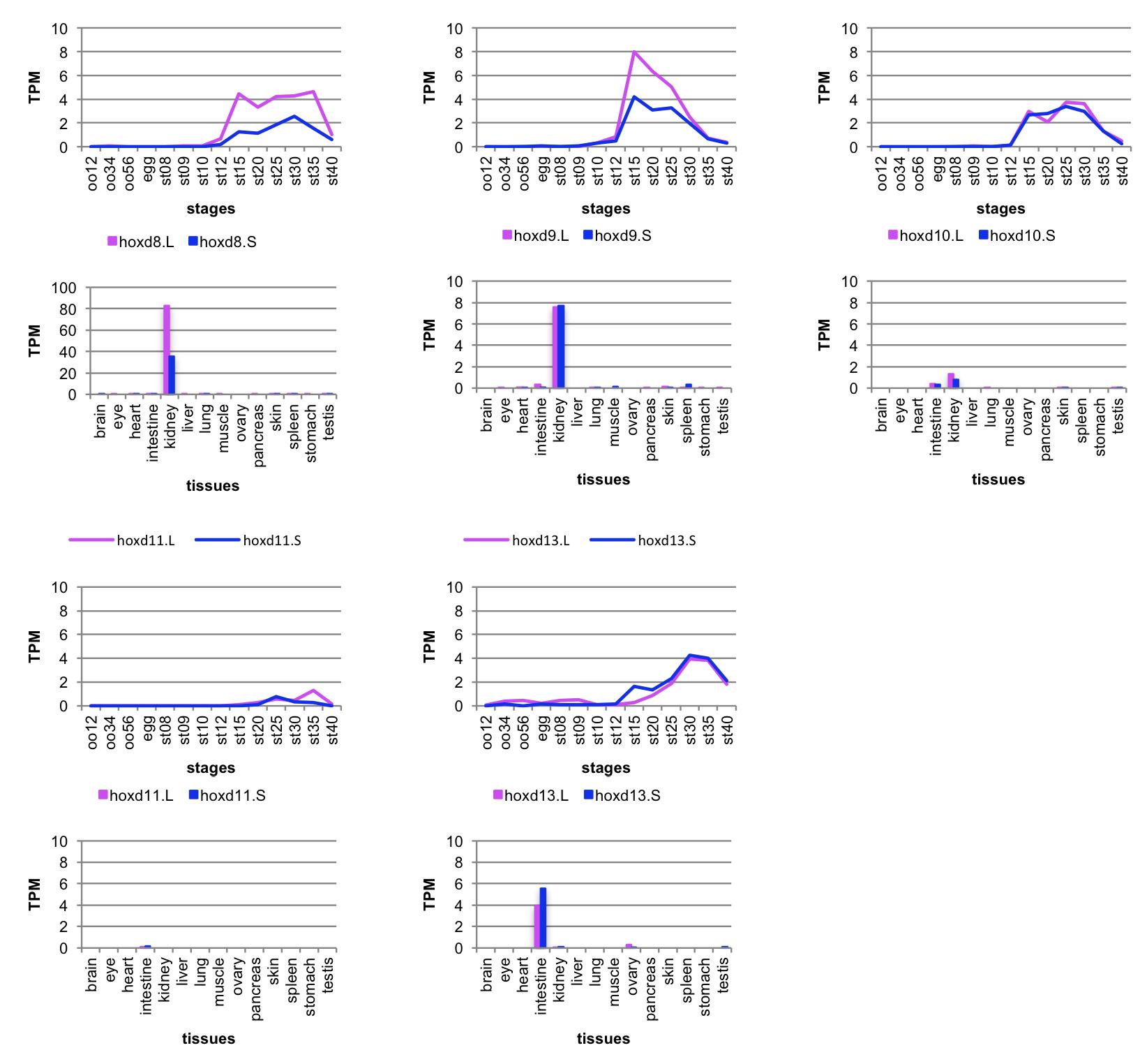 Fig. 5. Expression of hox genes in adulttissues. (A) Expression levels of 43 genesthat had TPM more than 2.5 at somepoint were normalized so that the peakTPM is 1. By clustering analysis, thegenes were grouped into eight, dependingon the tissue(s) with the most expression.The genes in the “kidney+” group showedexpression in kidney and some other tis-sue, whereas the “kidney” group geneswere expressed exclusively in kidney. (B)Summary of expression profiles. Asterisksindicate homeologs that show a similarpattern of expression. |