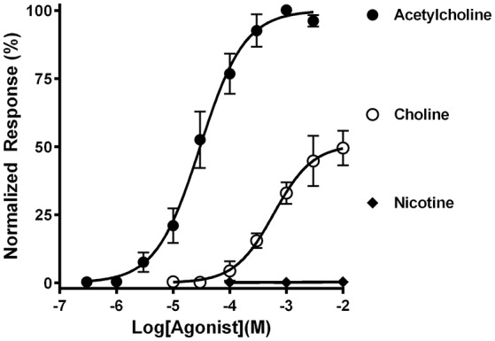 Richter, Phosphocholine - an agonist of metabotropic but not of ionotropic functions of α9-containing nicotinic acetylcholine receptors. 2016, Pubmed , Xenbase