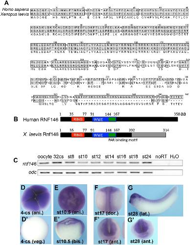 Expression of Rnf146 during early Xenopus development. (A) Peptidyl sequence alignment of Rnf146 from humans and Xenopus. (B) A schematic comparison of Rnf146 from humans and Xenopus. (C) RT-PCR examination of Rnf146 expression in early Xenopus development. odc serves as loading controls. (DâG) Embryos at different stages in situ hybridized with rnf146. ani.: animal pole view. dor.: dorsal side view. lat.: lateral view. bis.: bisection view.