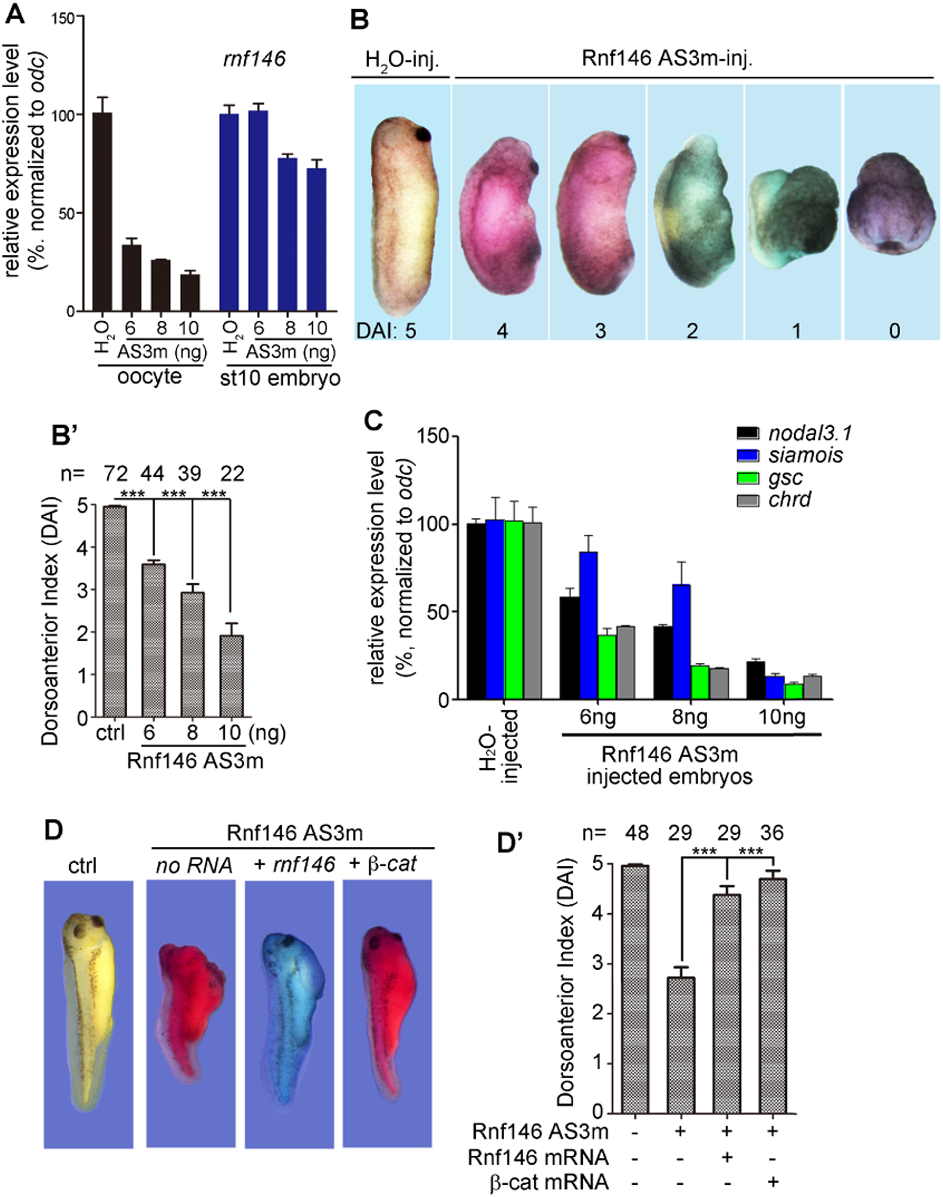 Ventralized development from depletion of maternal Rnf146. (A) RT-qPCR results showing that a specific antisense ODN (AS3m) depleted the maternal store of rnf146 mRNA in oocytes in a dose dependent manner, but had limited effects on the expression of rnf146 mRNA in early gastrula stage (stage 10) embryos. (B) Representative embryos at stage 22/23 from a typical host experiment where 6â10 ng Rnf146 AS3m were injected. DAI: dorsal anterior index. Normal embryos are scored as DAI 5; the fully ventralized embryos were scored as DAI 0; partially ventralized embryos were scored DAI ranging from > 0 lesser than 5. (Bâ²) Histographic presentation of DAI scores from maternal Rnf146 depletion experiments representatively shown in (B). ***P < 0.001 by Student t-test. Embryos from three repeated experiments were pooled together for DAI scoring per the scales depicted in (B). Numbers of embryos for each treatment group are shown on the top of each histogram. (C) RT-qPCR examination of organizer gene expression in control and 6â10 ng AS3m injected embryos at stage 10. Data shown as mean + SD. Error bars were obtained through the statistical treatment of technical replicates. (D, Dâ²) Assessment of specificity of maternal Rnf146 depletion using the antisense ODN AS3m. (D) Representative embryos at the early tadpole stage with indicated treatments. 200 pg mRNA encoding Rnf146 was injected into AS3m (8 ng)-injected oocytes before progesterone treatment. 200 pg mRNA b-catenin was injected into subequatorial zone of maternal Rnf146-depleted embryos at the 2-cell stage. (Dâ²) Histographic presentation of DAI scores from maternal Rnf146 depletion experiments representatively shown in (D). ***P < 0.001 by Student t-test.