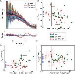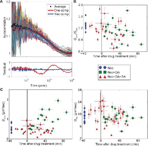 FIGURE 4:. Fluorescence correlation spectroscopy of HeLa CDCA8-GFP-3xFLAG cells. Mitotic cells were identified and CPC localization to centrosomes confirmed by conventional imaging. The FCS measurement beam was directed into the cytoplasm near the edge of cells away from chromosomes to report on soluble CPC diffusion. (A) Example autocorrelation curves (top; black circles represent averages, and red and blue lines represent the fitted one- and two-component FCS models, respectively) and weighted residuals (bottom). (B) Ratio of amplitudes of slow- to fast-diffusing populations over time after drug treatment. Amplitudes are proportional to the number of molecules in a focal volume and molecular brightness squared. (C) Diffusion coefficients over time after drug treatment of the slow (left) and fast (right) populations in the presence of 1 µM nocodazole, with no further drug treatment (blue circles), or after treatment with only 250 nM okadaic acid (OA; green squares) or with both 250 nM OA and 250 nM barasertib (BA; red triangles). Each data point represents one mitotic cell, identified by observing round cell morphology and chromosomes in phase contrast, and averages were obtained by taking multiple measurements in each cell at each time point. Error bars represent the SD of the fitted parameters of the nonlinear regression. |