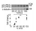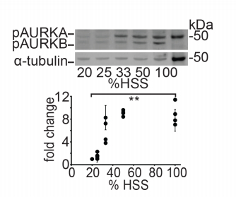 Figure S2: Mitotic HSS was diluted 1, 2, 3, 4, or 5-fold in S-CSF-XB-phosphate buffer, okadaic acid was added at a constant concentration, and the reactions were incubated at room temperature for 25 minutes. Reaction aliquots containing the same amount of HSS were immunoblotted with the antibody against the pT232-AURK epitope. The intensity of the samples was normalized to α-tubulin intensity and across biological replicates, setting the lowest value to one. Error bars represent standard deviations, and the p-value between 100% and 20% HSS is 0.0019, n=4. |