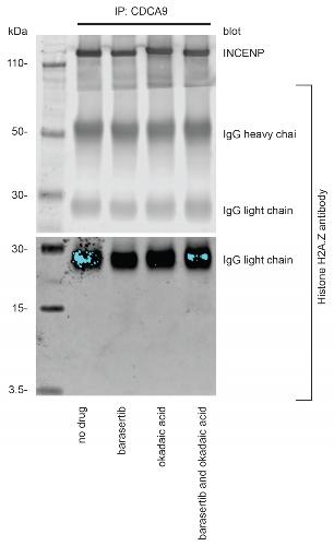 Figure S10. Mitotic HSS was treated with no drug, barasertib, okadaic acid, or both, and then Dynabeads conjugated with antibody against CDCA9 were used to immunoprecipitate the CPC. The beads were then immunoblotted for INCENP and histone H2A.Z. |