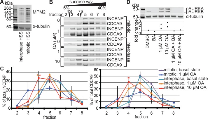 FIGURE 2:. CPC hydrodynamic properties are similar in interphase and mitotic HSS. (A) Interphase HSS was prepared by cycling CSF X. laevis egg extract into interphase with calcium and then adding cycloheximide, followed by the high-speed spin. Equal amounts of interphase and mitotic HSS prepared from the same extract were blotted with an MPM2 (mitotic phosphoprotein monoclonal) antibody that recognizes many CDK1 phosphosites more prevalent in mitosis (Kuang et al., 1994; Field et al., 2014). Interphase extract was prepared more than five times and compared with mitotic HSS prepared from the same crude extract using MPM2 blots twice. (B) Sucrose gradients were run as in Figure 1. Mitotic and interphase HSS were prepared from the same extract. Fractions were immunoblotted with antibodies raised against INCENP and CDCA9 after SDSâPAGE. Full blots with molecular weight markers are given in Supplemental Figure S3. (C) Sucrose gradient blots from B were quantified as in Figure 1D. Error bars represent SD; n = 2. For fraction 4, significant p values comparing basal interphase HSS and interphase HSS dosed with 1 and 10 μM okadaic acid (OA) were calculated to be 0.011 (INCENP, 1 μM OA), 0.050 (INCENP, 10 μM OA), and 0.014 (CDCA9, 10 μM OA); n = 2â5. (D) Mitotic and interphase HSS samples prepared from the same extract were incubated with the indicated drugs as in Figure 1. The reactions were then blotted with antibodies against pT232-AURKB and α-tubulin, and pAURKB levels were quantified by normalizing to α-tubulin; n = 2. |