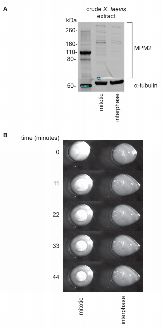 Figure S4. (A) Samples of mitotic or interphase crude X. laevis extract were immunoblotted using an antibody against MPM2 epitopes. (B) Droplets of interphase or mitotic extract (1 μL) from the same extract were placed into a room temperature mineral oil bath and observed via dark field microscopy for a period of approximately 45 minutes. |